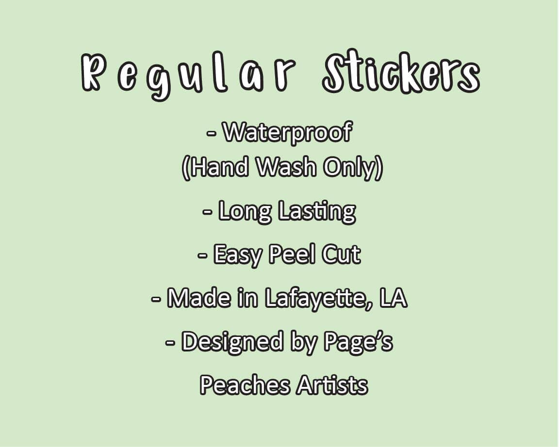 If our mini stickers aren't your style or you want to compliment them, these waterproof stickers are perfect for adding a touch of personal style to your phone case, water bottle, laptop, journals, or anything else. These stickers feature an easy peel cut and are waterproof (hand-wash only!) giving you the extra security you need to put them on any surface. They are made from original artwork that you will not find anywhere else but Page's Peaches! These stickers are perfect for anyone who loves to decorate their belongings with unique and creative designs.