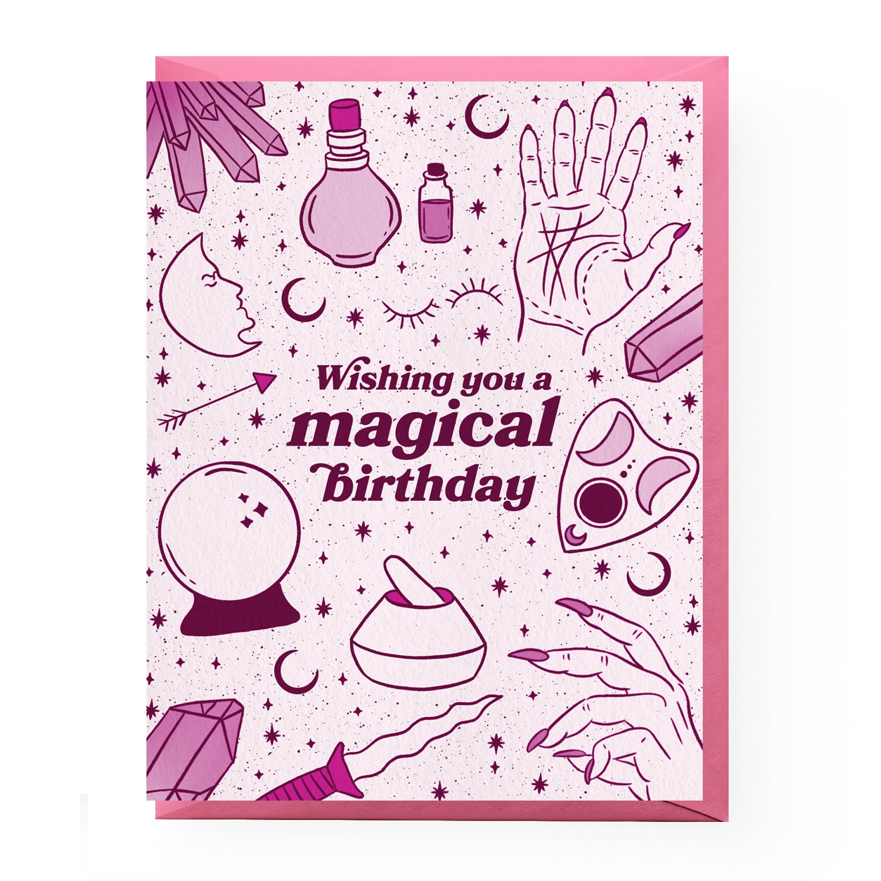 Card reads "Wishing you a magical birthday" and features a magical illustrated patterned filled with potions bottles, a crystals and a Ouija board planchette.