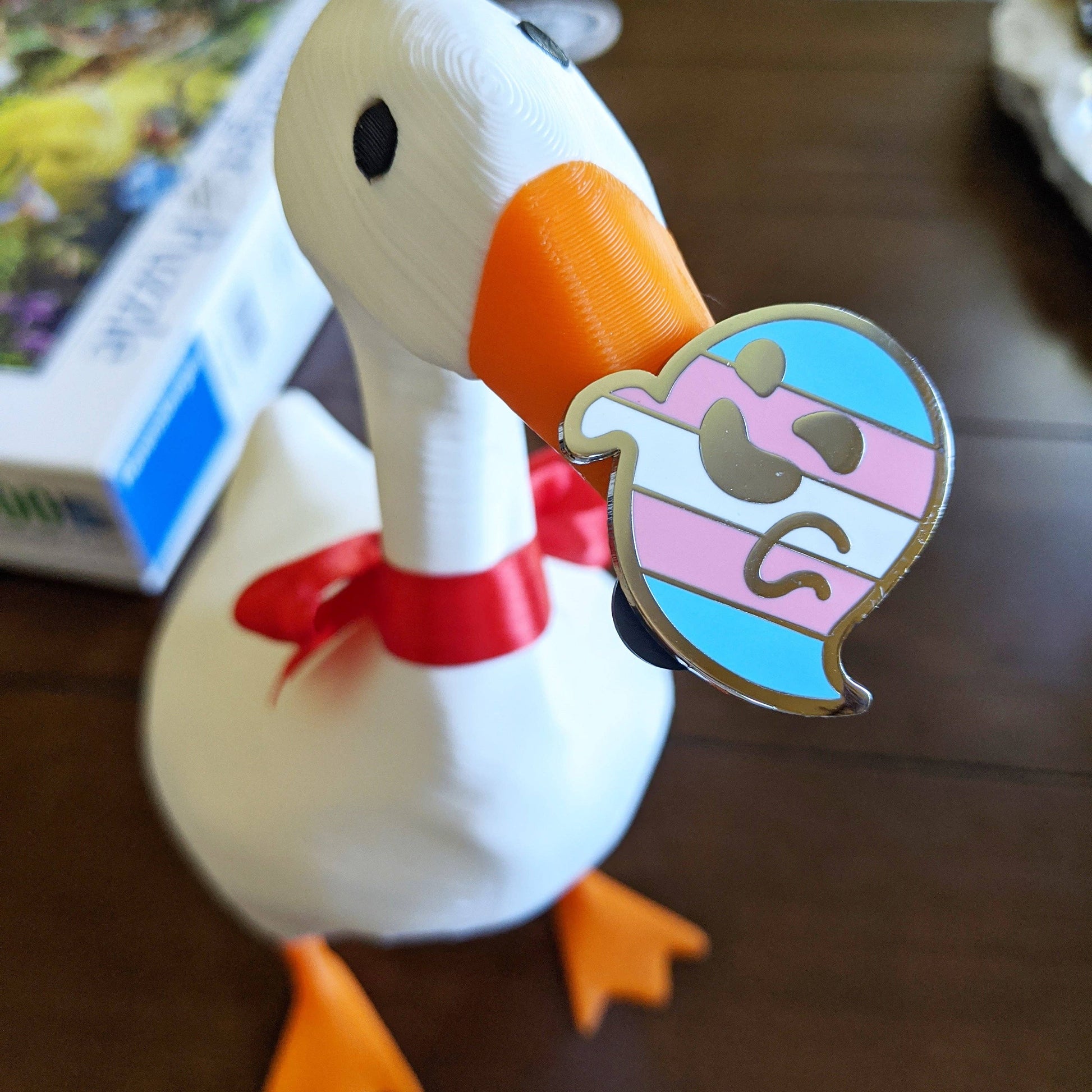 This adorable ghost enamel pin features the transgender pride flag.