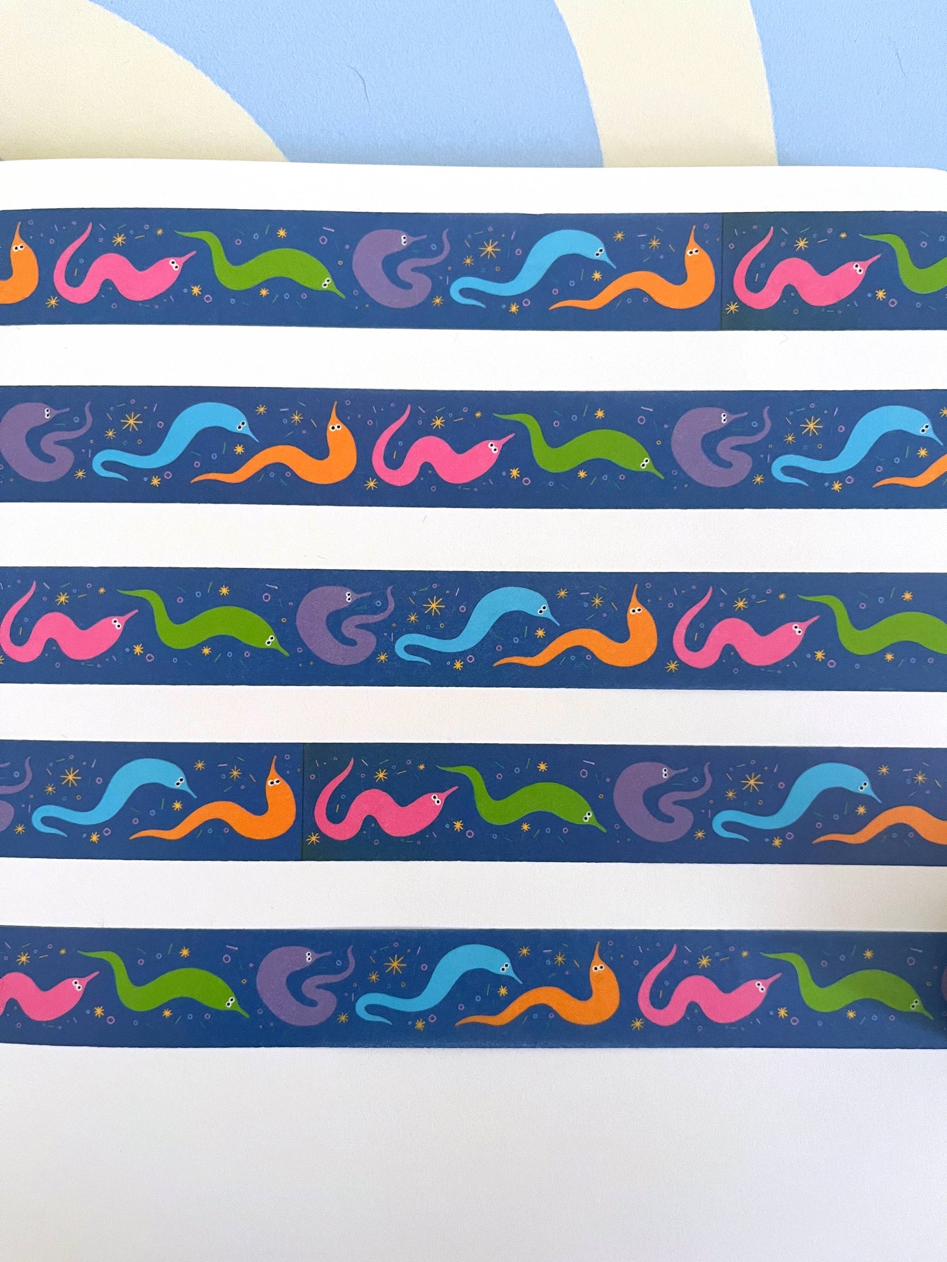 Inspired by quirky and whimsical worm-on-a-string toys, this nostalgic washi tape rocks a repeating pattern of colorful, wacky worms. Maximalists and crafty kids at heart will love this unusual addition to their stationery collection.